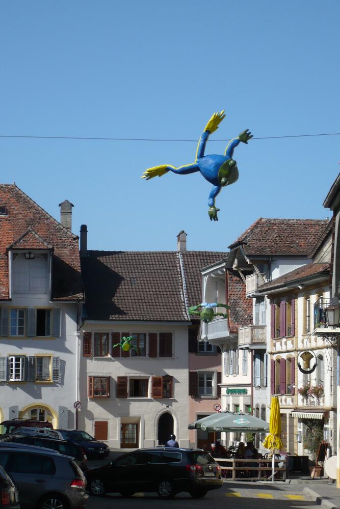 Estavayer-le-Lac vu de l'intérieur. Y a un musée de la grenouille connu, d'où la déco des rues.