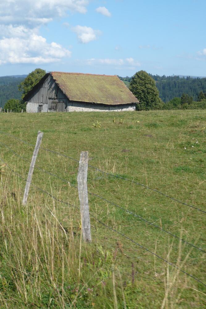 La vieille ferme (abandonnée?) au milieu de son champs.